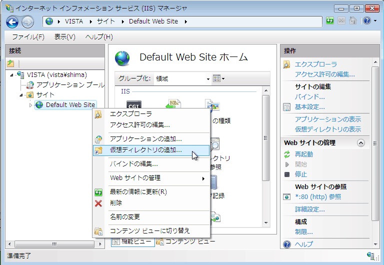 - 右クリックでポップアップメニューを表示して[新規作成]-[仮想ディレクトリの追加...]を選択して仮想ディレクトリの追加を行います。