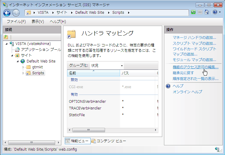 - 仮想ディレクトリの物理パスにCGIのルートディレクトリを指定します。