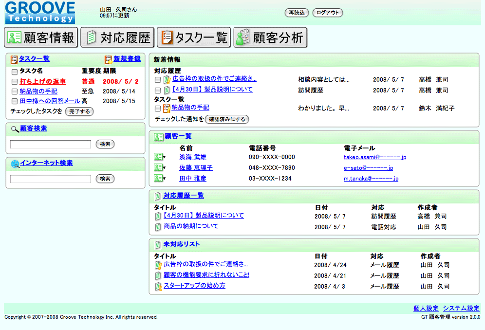 「GT 顧客管理」は、電話・メールによる問い合わせや対応履歴、購入履歴といった顧客の情報を一元管理して、社内で共有できます。